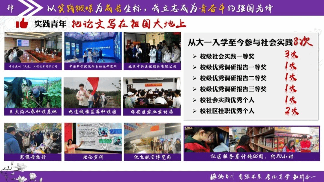 在马栏街道社区挂职中,她帮助老人跨越数字鸿沟,宣传反诈知识;前往东北三省为传统产业智能化转型提供青年视角与建议;走进辽宁丹东于田间地头采样,贡献智慧农业。获评社会实践优秀个人,连续两年获评社区实践优秀个人。