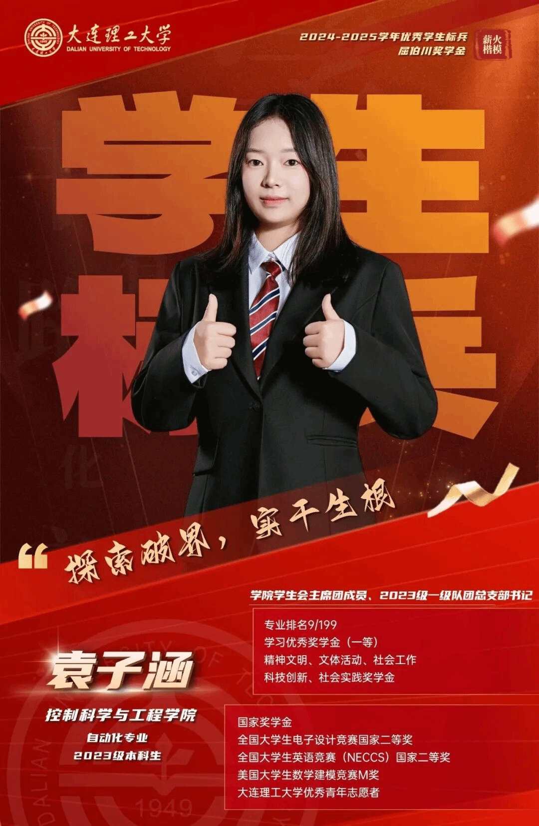 自入学以来,她积极向党组织靠拢,第一时间提交入党申请书,主动加入大学生理论研究会,参与“雁阵计划”培训,目前已确认为2023级首批入党发展对象。她感受了大工人与国同行、生而不凡的历史使命,以高远目标为向上坐标,锚定学术大师,希望能在无人系统领域成为杰出女科学家。