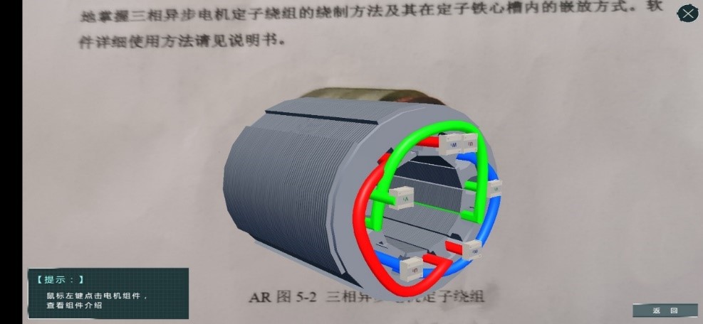 手机增强现实学习软件(APP)具备上述相似功能,该软件与教材紧密结合,当学生用手机扫描教材上的电机图片时,可自动识别电机种类,电机的三维模型将跃于纸上,映入眼帘,学生可进行旋转、缩放、拆分、组合等一系列操作。该套软件解决了《电机与拖动》课程教学中的难点问题,方便了教师课堂教学,激发了学生学习的积极性和趣味性。