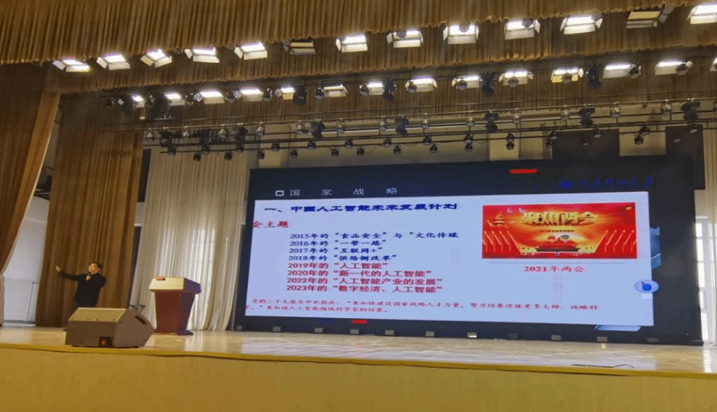 在报告中,王老师从历史观点,用大量的数据、多彩的场景、幽默的语言分享了人工智能的发展、现在和未来,分享了他的学习之路、创新之路、科研报国之路。王老师在报告中告诉大家,科研不应止步于实验室,还要”纸上得来终觉浅,绝知此事要躬行“,要“从实验室走向工厂,再从工厂走向市场”,鼓励大家立鸿鹄志、砥砺奋斗、全面发展,以梦为马,走向星辰大海,做有大爱大德大情怀的社会主义事业接班人。
