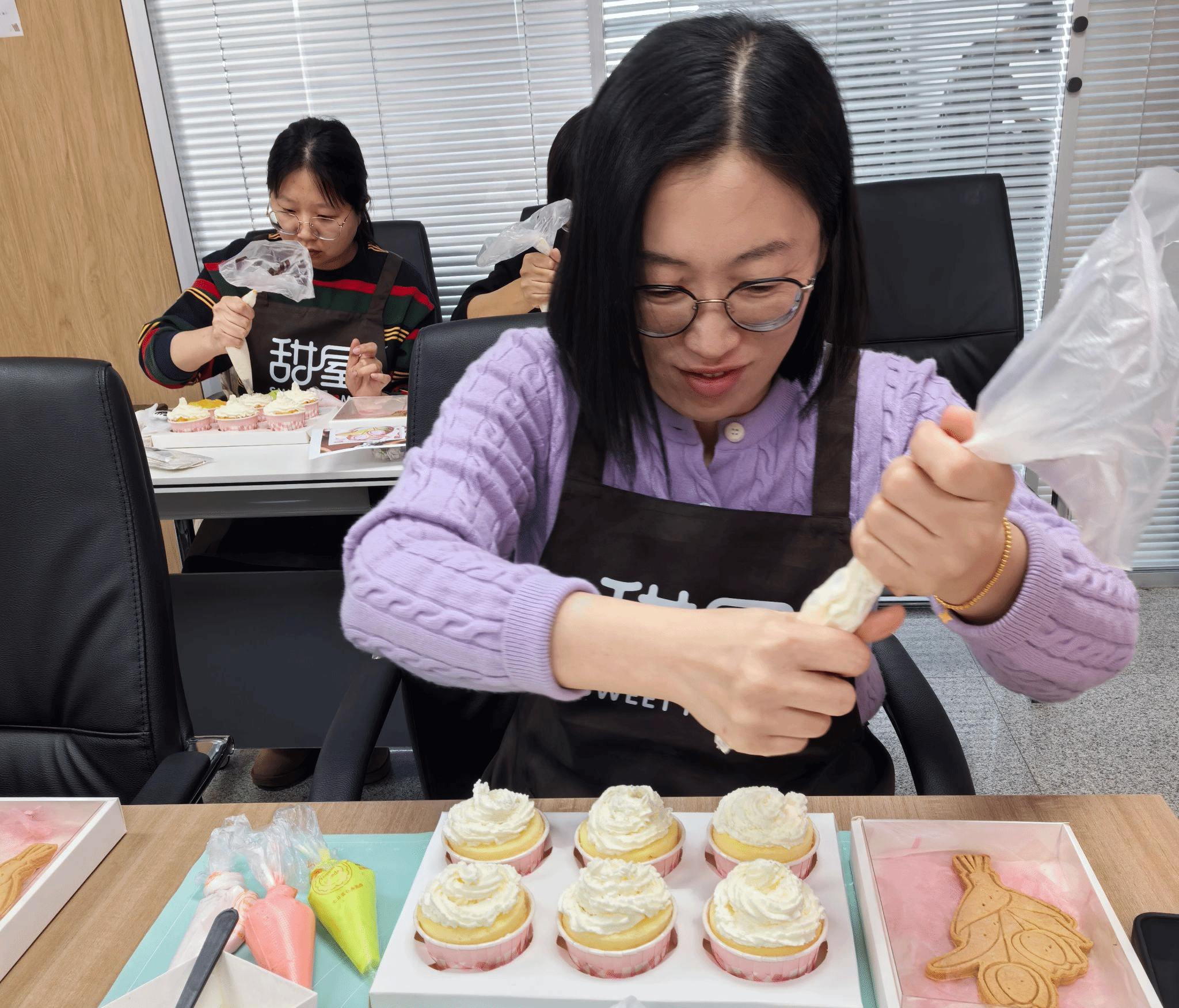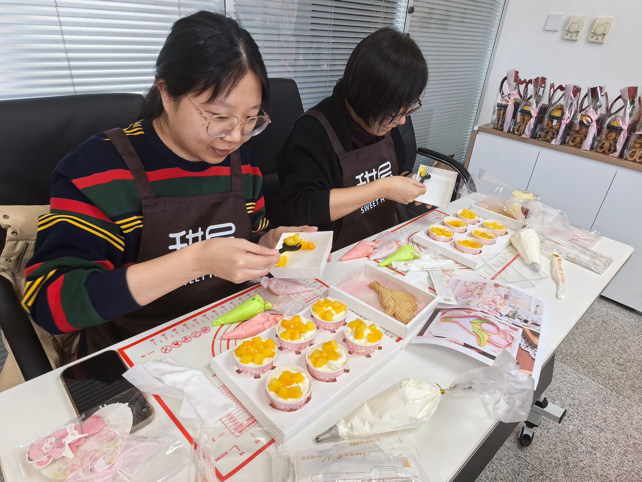 活动伊始,专业面点师向大家讲解了烘焙食材搭配、裱花技巧,演示了制作步骤。随后在师傅的指导和示范下,女教职工们纷纷化身心灵手巧的“甜点大师”,开启了属于自己的烘焙时光。现场气氛融洽,欢声笑语不断。大家充分发挥想象力和创造力,制作风格不同的烘焙作品。每一件作品都承载着女教职工们的心意与创意,也凝聚着大家对生活的热爱。大家手捧着自己的劳动成果,脸上洋溢着幸福与自豪的笑容,纷纷拍照留念,记录下这一甜蜜美好的时刻,分享着烘焙带来的快乐与成就感。