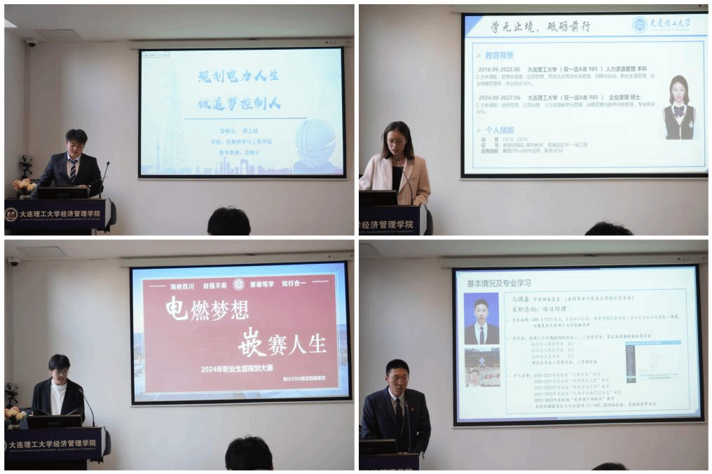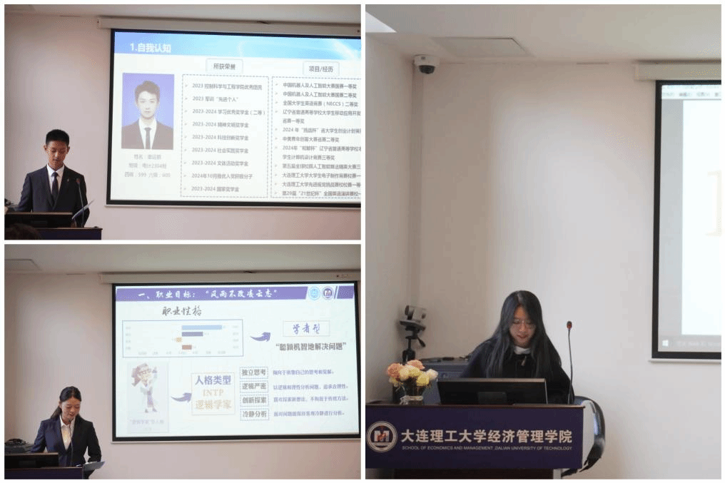 经过前期的作品遴选、修改打磨后,共有成长赛道9名选手和就业赛道7名选手站在初赛现场同台竞技,以“筑梦青春志在四方,规划启航职引未来”为主题,对个人职业生涯规划进行现场汇报展示。选手们自信从容地将个人职业蓝图娓娓道来,从职业测评结果、SWOT分析、自我认知、职业定位、评估调整方案等角度多维度剖析。他们统筹专业优势、兴趣爱好和性格特点,客观认识外部环境,结合个人经历与实习经验确定了职业目标。选手的职业规划有嵌入式工程师、高级光电工程师、电力工程师、智能算法工程师、高校教师、公务员,有产品经理、项目主管等,根据岗位要求制定了阶段性计划,向理想职业不断努力,充分体现了规划启航职引未来的活动理念。