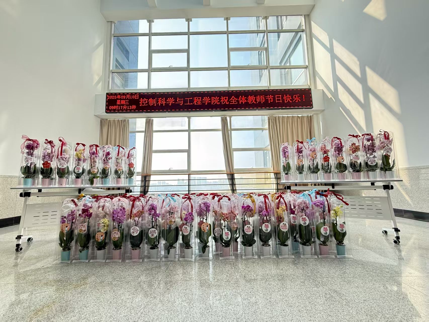工会于9月10日上午9:30在海山楼11楼中厅成功举办了一场以“礼赞师恩”为主题的蝴蝶兰花艺鉴赏活动,为辛勤的园丁们献上了一份独特而高雅的节日祝福。